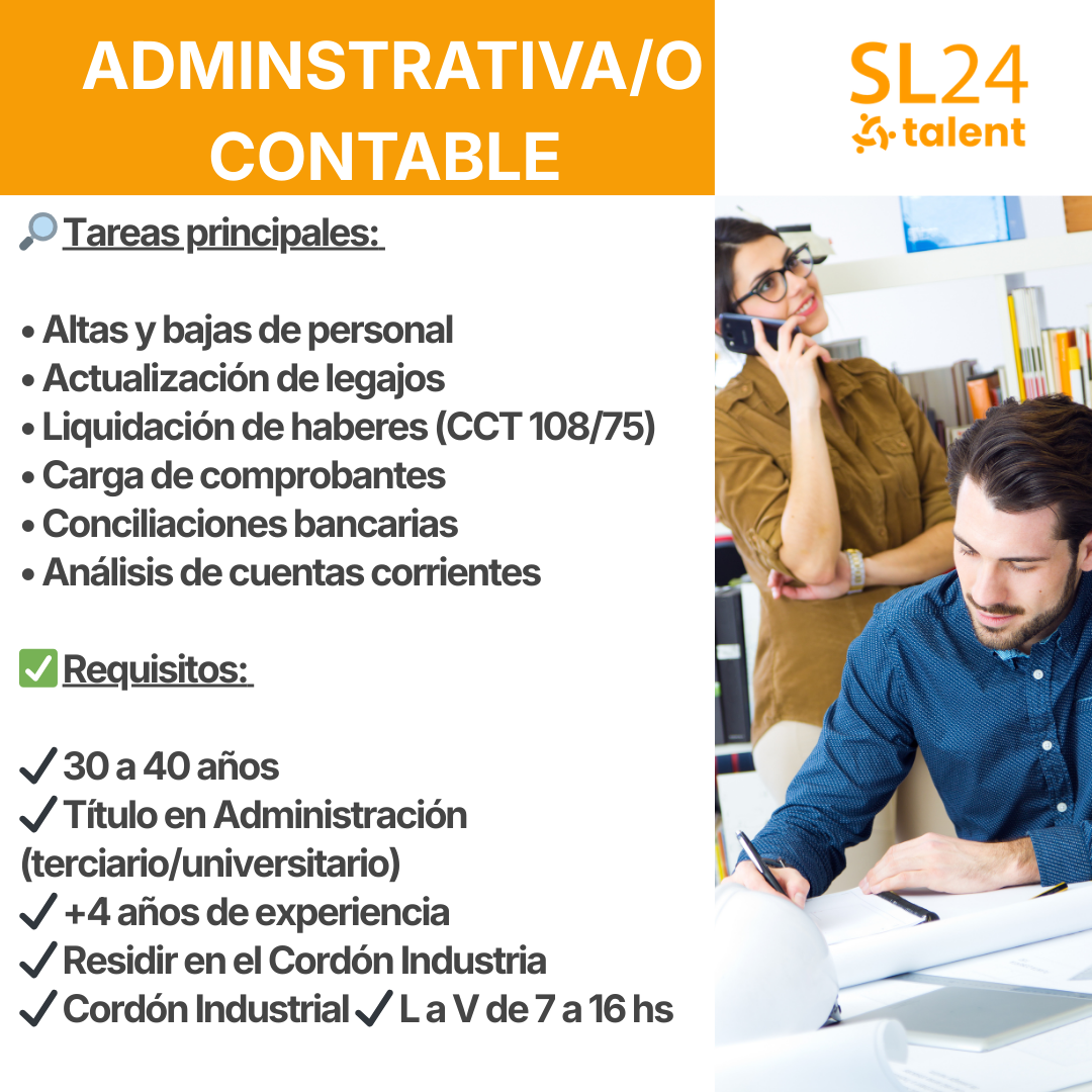 La persona seleccionada tendrá a su cargo tareas administrativas vinculadas al personal, como actualización de legajos, gestión de altas y bajas, y documentación laboral. Además, deberá realizar la liquidación de haberes bajo el CCT 108/75, carga de comprobantes en el sistema de gestión, atención a proveedores, archivo de documentación y análisis de cuentas corrientes. También se espera experiencia en imputaciones contables y conciliaciones bancarias, junto a las tareas administrativas generales propias del sector.