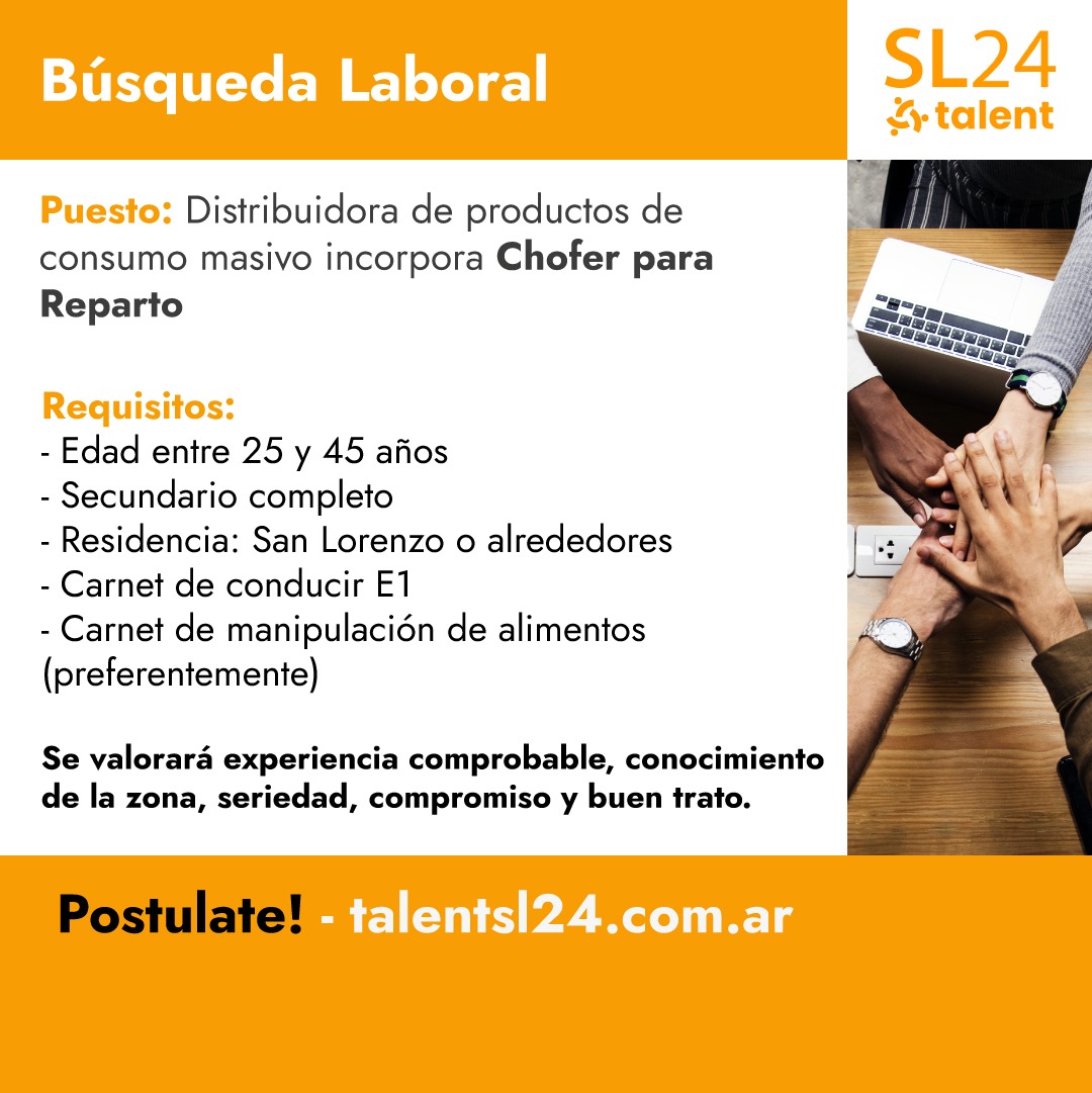 Distibuidora de productos de consumo masivo busca chofer para reparto.
