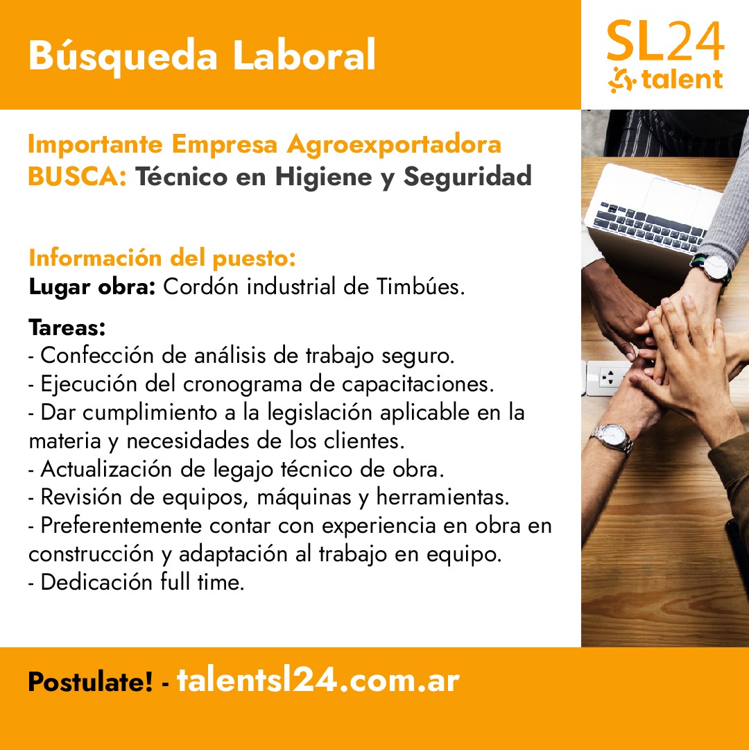 Estamos buscando sumar un Técnico en Higiene y Seguridad para trabajar en obra ubicada en cordón industrial de Timbúes. Tareas: • Confección de Análisis de trabajo Seguro • Ejecución del cronograma de capacitaciones • Dar cumplimiento a la legislación aplicable en la materia y necesidades de los clientes • Actualización de legajo técnico de obra • Revisión de equipos, máquinas y herramientas. Preferentemente contar con experiencia en obra en construcción y adaptación al trabajo en equipo. Dedicación full time