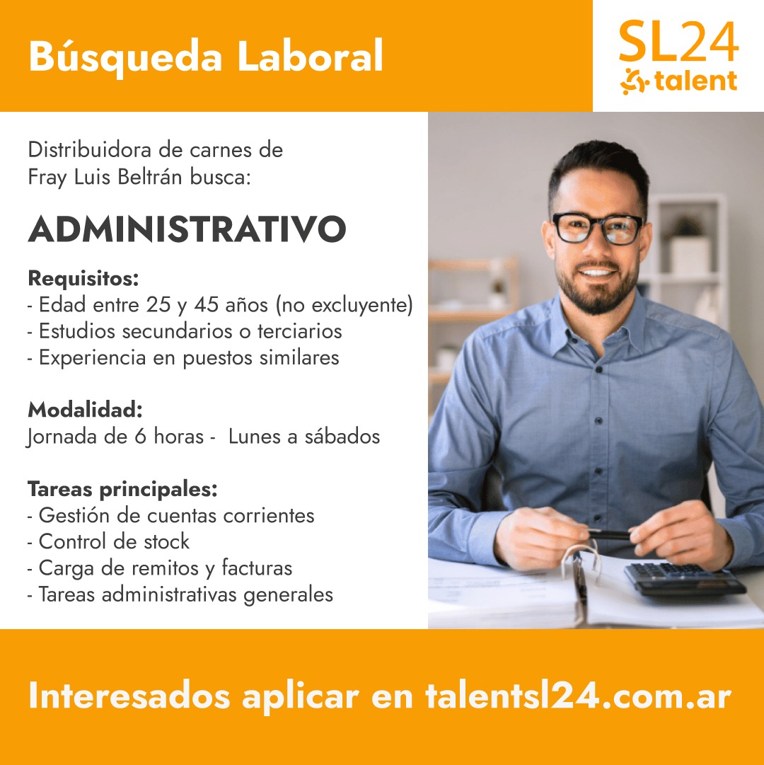 Importante distribuidora de carnes de Fray Luis Beltrán se encuentra en la búsqueda de un administrativo para sumarse a su equipo de trabajo. El puesto contempla una jornada laboral de 6 horas diarias, de lunes a sábados, y está orientado a personas con perfil organizado y experiencia en tareas administrativas vinculadas a la gestión comercial.